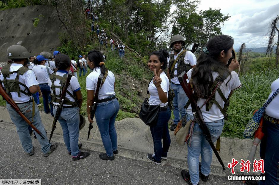 委内瑞拉举行军事演习 女民兵白衣持枪上阵