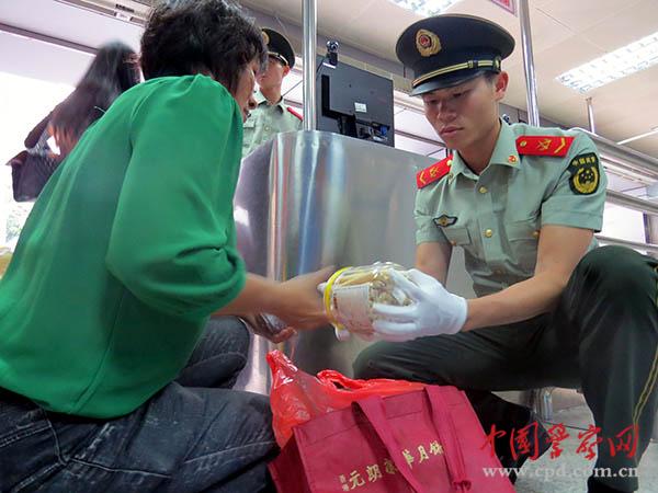 黄帅对过关人员的物品进行认真的检查。