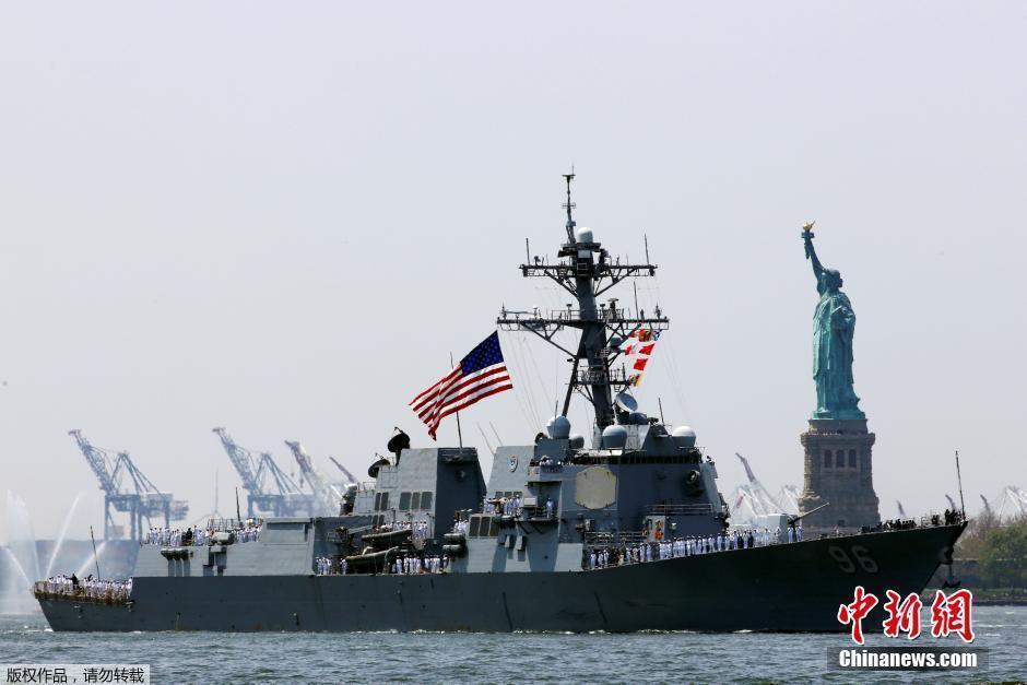 当地时间2016年5月25日,美国纽约,纽约舰队周开幕,美国和外国海军舰艇参加“舰船游行”标志着纽约舰队周活动开始。图为一艘伯克级驱逐舰现身纽约港。