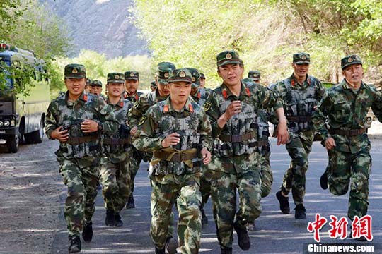 新疆森警体能训练:背20斤沙袋跑5公里山路