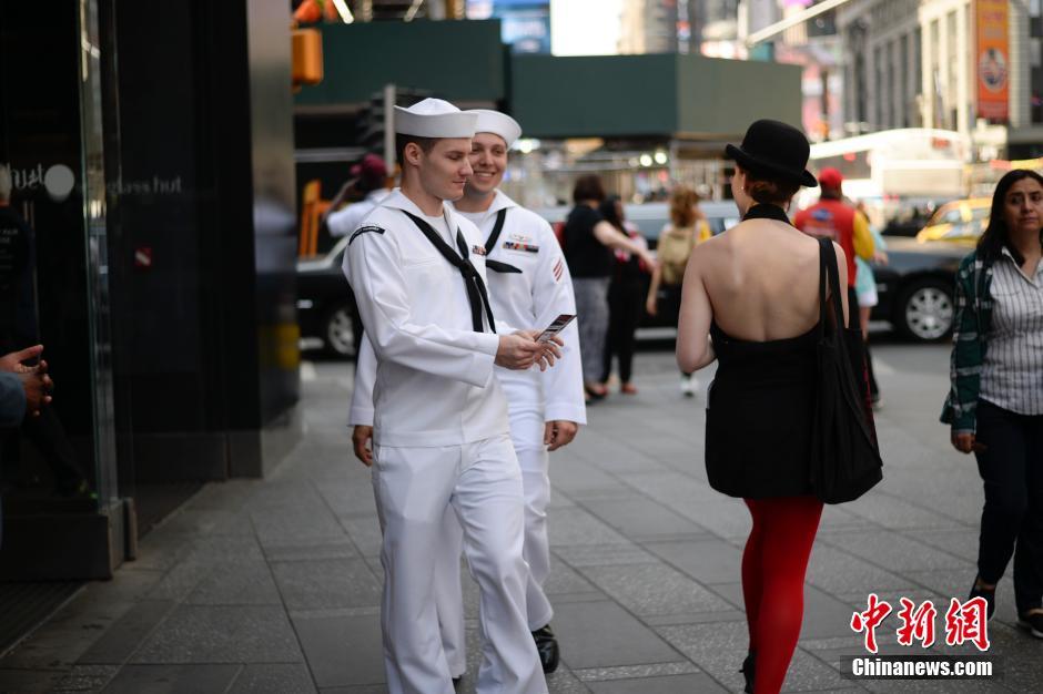 当地时间5月26日,美国纽约,海军水兵在时代广场,百老汇售票人员向其推销演出门票。第28届纽约舰队周于5月25日正式开始。廖攀 摄