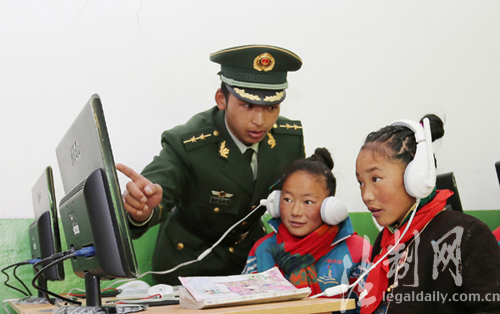 西藏山南边防支队普玛江塘派出所官兵教学生使用新电脑。