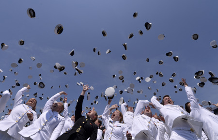 5月27日,在美国马里兰州首府安纳波利斯的美国海军学院,毕业生们将帽子抛向空中。