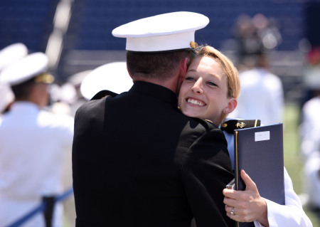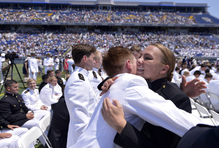 5月27日,在美国马里兰州首府安纳波利斯的美国海军学院,毕业生们相互拥抱,以庆祝毕业,也以示道别。