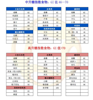 不同的食物有不同的升糖指数,通常把葡萄糖的血糖生成指数定为100。升糖指数>70为高升糖指数食物,它们进入胃肠后消化快,吸收率高,转化为葡萄糖的速度快,血糖迅速升高;升糖指数<55为低升糖指数食物,它们在胃肠中停留时间长,吸收率低,转化为葡萄糖的速度慢,血糖升高慢,人体有足够时间调动胰岛素的释放和合成,使血糖不致于飙升。