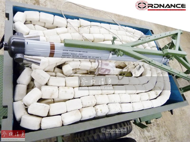 每个发射装置下方都搭载有这种呈折叠状态的M58扫雷爆破索,每根爆破索长107米,内含有总重794千克的C4塑胶炸药,炸药沿尼龙绳和导爆索四周均匀分布,发射时主要依靠Mk22型127毫米火箭发动机驱动。