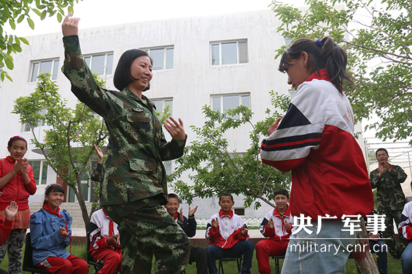 图为边防官兵和孩子们一起跳民族舞