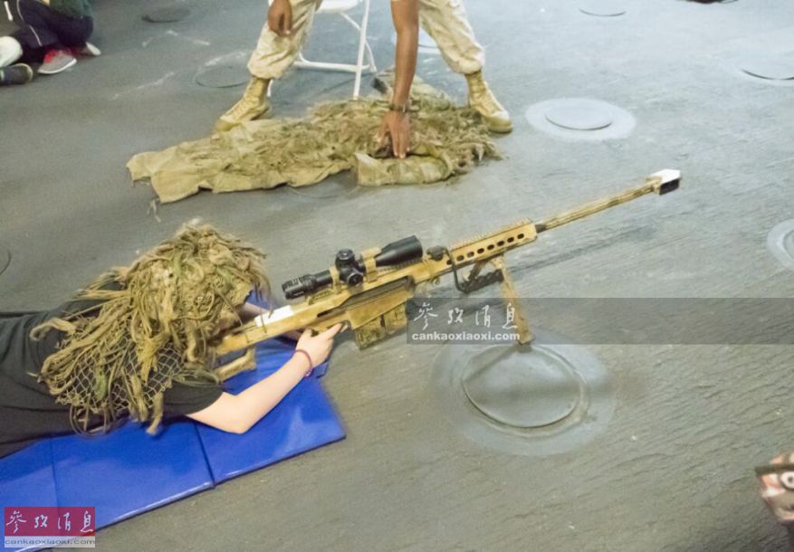 军械甲板还提供了军迷体验陆战队狙击手使用M107巴雷特反器材步枪的机会,连吉利伪装服都有提供,临场感十足。