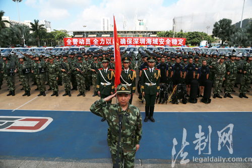 活动中,深圳边防支队调集了管辖沿海辖区的各大队、机动大队、国旗护卫队、汽车方队、蛙人海上特勤队等共计300名警力。随着深圳市委书记马兴瑞作动员讲话并宣布行动启动。现场爆发出铿锵有力的宣誓,300名官兵齐声高呼:“听党指挥、英勇善战、首战用我、用我必胜”。活动引来市民驻足围观,有力增强了市民的安全感。(陈阳红 龙宇翔)