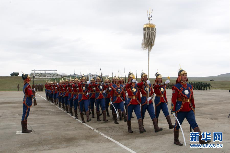 6月4日,在蒙古国首都乌兰巴托以西蒙军综合训练中心举行的“可汗探索-2016”多国维和军事演习闭幕式上,蒙古国仪仗队接受检阅。当日,“可汗探索-2016”多国维和军演在蒙古国首都乌兰巴托以西65公里处的蒙军综合训练中心落幕。包括中国在内的47个国家共派出两千余人参加了军演。新华社记者郑闯摄