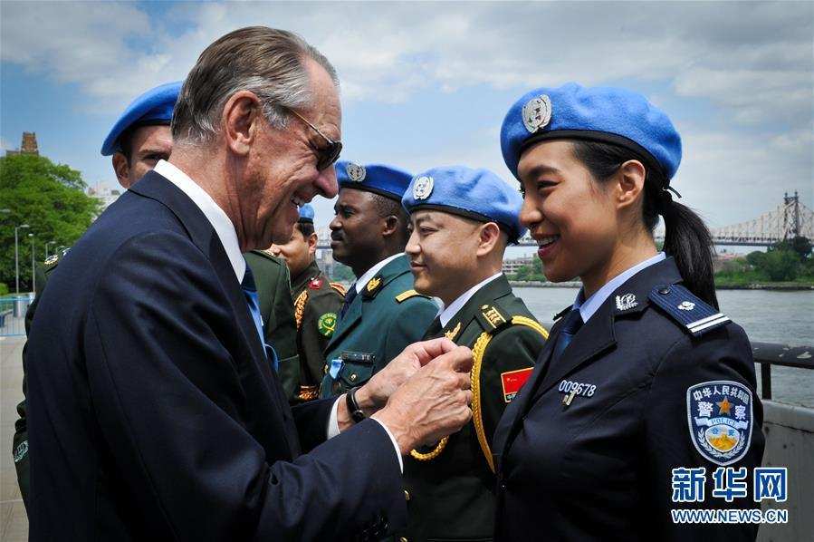 1990年4月,中国首次向联合国停战监督组织派出5名军事观察员,正式开启中国军队参加联合国维和行动的序幕。当前,在安理会常任理事国中,中国是派遣维和人员最多的国家。从黎巴嫩到利比里亚,从马里到南苏丹……许多战乱冲突地区都出现了中国维和人员的身影,有战士,有医生,也有从事后勤工作的人员。他们不远万里来到艰苦、危险的环境中工作,只为维护一方和平,保卫百姓的安全……中国维和人员积极履行使命,体现了中国的国际责任和义务,向世界传递着温暖。这是2014年5月29日,在纽约联合国总部举行的国际维和人员日纪念活动上,联合国常务副秘书长埃利亚松(左)为一名中国维和警察佩戴奖章。新华社记者牛晓雷摄