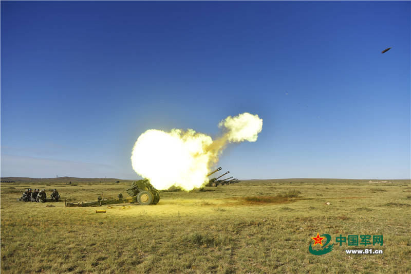某型加榴炮射击瞬间。
