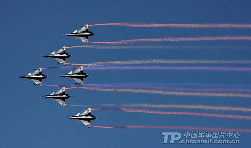图为空军八一飞行表演队歼十表演机大仰角上升。