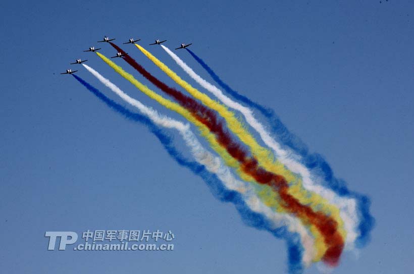 空军第三飞行学院“红鹰”飞行表演队于2011年3月成立,队员全由飞行教员担任,其中有3名特级飞行员、15名一级飞行员,个人飞行总时间都在1200小时以上。他们将进行8机、6机、5机、双机和单机表演。图为“红鹰”飞行表演队8机鹰队蓝天列阵,劲舞苍穹竞风流。乔天富摄