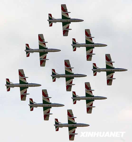 “三色箭”表演队于1961年7月1日正式成立,是世界上最成功的飞行表演队之一,它与英国的“红箭”法国的“法兰西巡逻兵”并称为西欧飞行表演三杰。其飞行员来自意大利空军各个战斗部队,并要求飞行员服役期不得少于6年,飞行时间不得低于1000小时。图为在俄罗斯茹科夫斯基市举行的国际航空航天展上,意大利空军“三色箭”飞行表演队奉献精彩的飞行表演。新华社记者鲁金博 摄