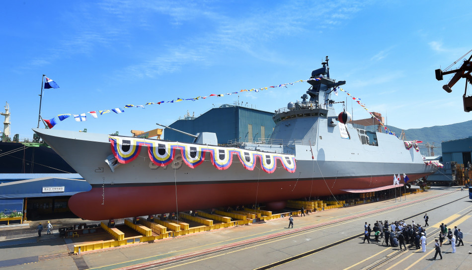 6月2日,韩国海军新型护卫舰(FFG-II)首舰“大邱”号在庆尚南道巨济大宇造船厂下水。该舰排水量2800吨,长122米,宽14米,高度34米,最大航速30节,可搭载一架直升机海上作业。该舰采用采用混合动力推进系统,具备防空、反舰、反潜及对地作战任务。