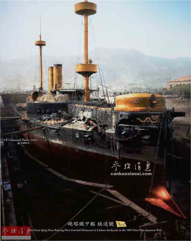 1894年,中日甲午海战前夕,停泊在旅顺船厂船坞进行维护的大清帝国海军“镇远”号战列舰。