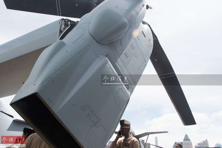 展示的这架MV-22的推进装置处于“过渡飞行”状态。在垂直起降状态时,推进装置可向上旋转90度,产生升力,MV-22便可像直升机一样垂直起飞、降落或悬停;巡航状态时,推进装置可转到水平位置产生向前的推力,像固定翼螺旋桨飞机一样依靠机翼产生升力飞行。