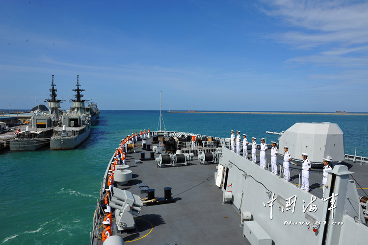 泰国军方在梭桃邑海军基地码头举办了欢送仪式,泰海军陆战师师长桑功少将和我驻泰武官张力大校,率泰方官兵、使馆工作人员,以及100余名光华学校师生前来送行,并表演了民族舞蹈。