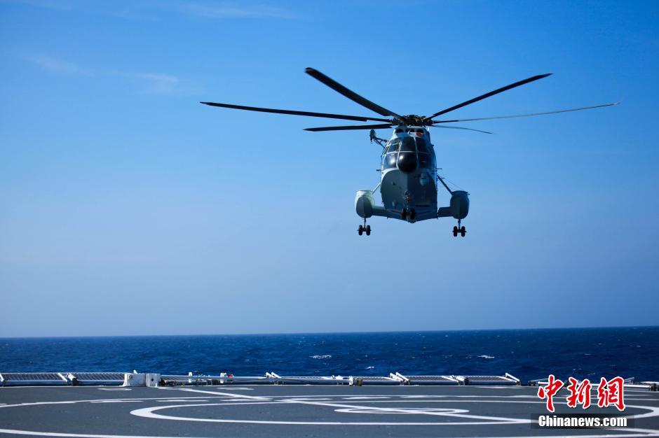 6月16日,参加“环太平洋-2016”演习的中国海军舰艇编队向预定海域航渡。图为和平方舟医院船舰载直升机着舰。中新社记者 李纯 摄