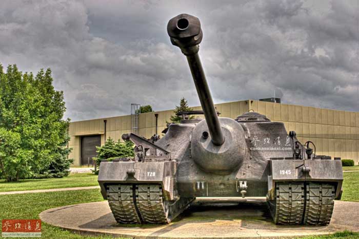 为能承受超常规的车体尺寸,T28采用了独特的行走系统,每一侧都配备了两条履带及8套悬挂系统,全车共有四条履带和16套悬挂系统,其中最外侧的8套是独立的可拆卸组件。 本图可见T28壮观的四履带行走机构,值得一提的是,左右最外侧的两条在行军时是可拆卸的。