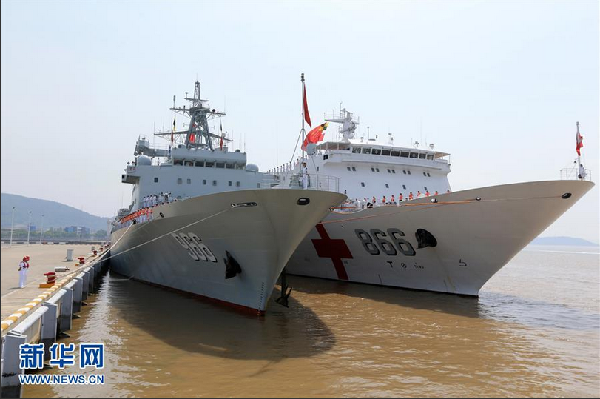 6月15日,综合补给舰高邮湖舰(左)与和平方舟医院船(右)准备出发。