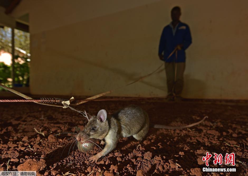 当地时间6月17日,坦桑尼亚莫罗戈罗,在当地的APOPO训练中心,一只阿富汗巨颊囊鼠正在被训练探测埋在土地里的地雷等金属物品。相对于普通的地雷探测器,这些小老鼠们探测地雷的速度要快很多,它们能够非常迅速的探测到深埋在土地中含有金属成分的物体。