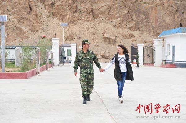 6月9日,阿依仙·古丽从300多公里之外的喀什来到这里探望丈夫,在派出所营区,阿吉买买提·吾守尔向妻子介绍了派出所官兵担负的职责使命,参观营区,两人交流了起来。