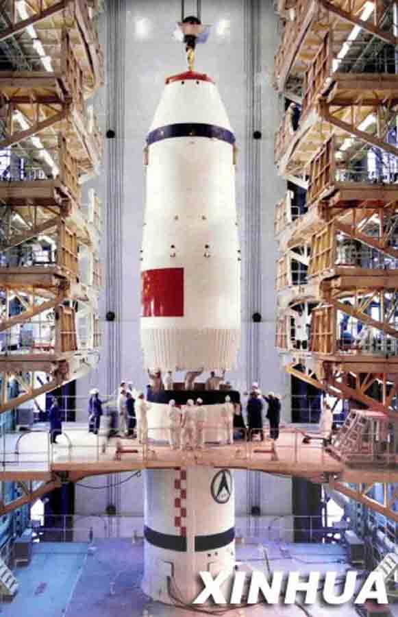 图为发射前,由中国空间技术研究院、上海航天技术研究院为主研制的“神舟二号”飞船正与由中国空间技术研究院研制的“长征二号F”大推力运载火箭对接。 新华社 发