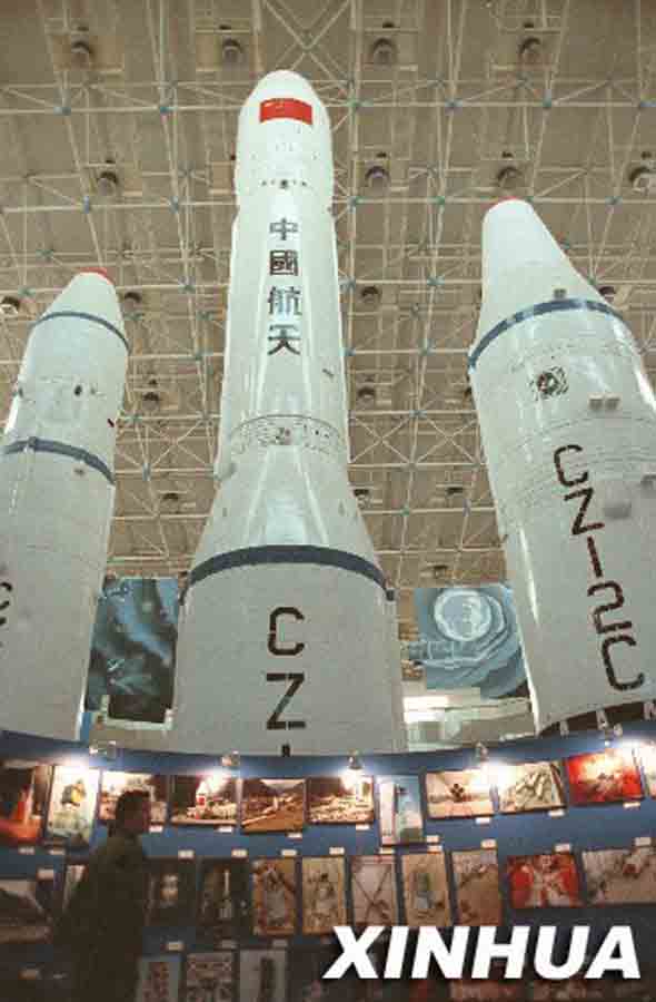1992年的10月中旬,中国航空航天工业部在北京中国运载火箭技术研究所新落成的展览厅里举办了“中华航天博物馆”预展,这是展出的“长征一号”(左),“长征二号丙”(右),“长征三号”(中)运载火箭(均为实体)。 新华社发