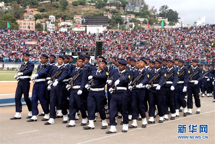 6月26日,马达加斯加宪兵仪仗队在首都塔那那利佛举行的阅兵式上接受检阅。 当日,马达加斯加举行国庆日阅兵活动,庆祝独立56周年。新华社发 (埃里克摄)