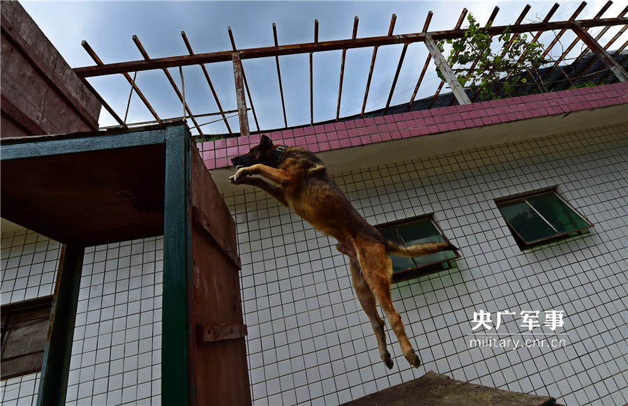 缉毒犬“黑罗”正在进行越障碍登高训练。