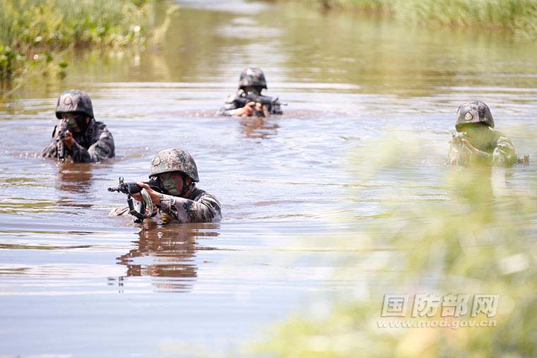 战士们正在沼泽地水沟中搜索“敌人”。