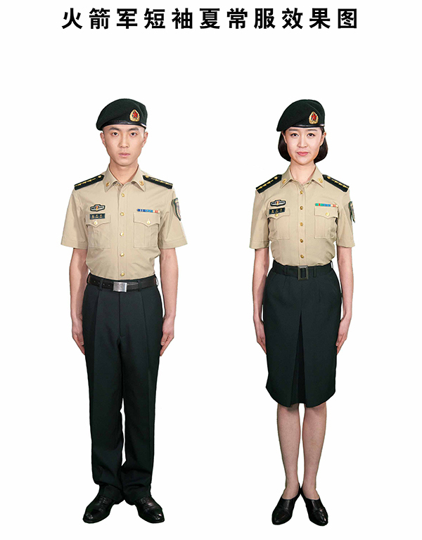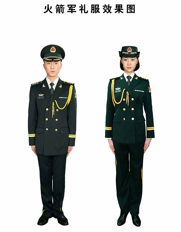 吴谦说,这次换发的火箭军新式礼(常)服,是在现行07式军服体系内,保持礼(常)服样式、结构、材料不变,对服装颜色进行设计调整,新式礼(常)服主色调采用墨绿色,衬衣和长(短)袖夏常服上衣为卡其色,礼(常)服大(卷)檐帽牙线和领带为浅墨绿色。
