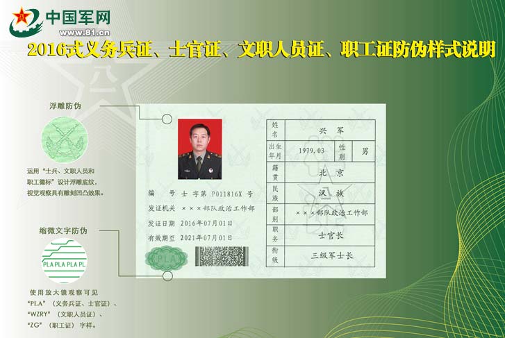 2016式军官证、义务兵证、士官证、文职人员证、职工证防伪样式说明