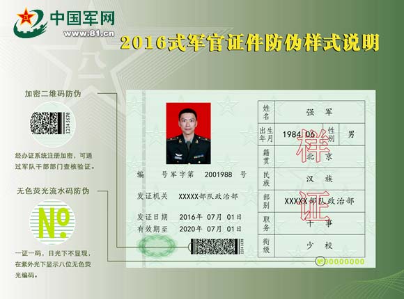 2016式军官证、义务兵证、士官证、文职人员证、职工证防伪样式说明