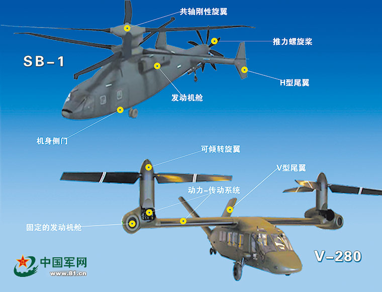 SB-1沿用了西科斯基公司引以为豪的共轴刚性旋翼技术,V-280则采用了贝尔公司一贯坚持的倾转旋翼技术。共轴刚性旋翼在最大程度上保留了直升机的工作模式,能够具备更高的悬停效率和更好的机动性;倾转旋翼既是垂直起降时的旋翼,又是高速前飞时的螺旋桨,其稳定前飞模式与固定翼飞机无异,前飞效率更高。两款直升机最大巡航速度分别达到460公里/时和520公里/时,最大起飞重量不约而同设定为13.6吨。