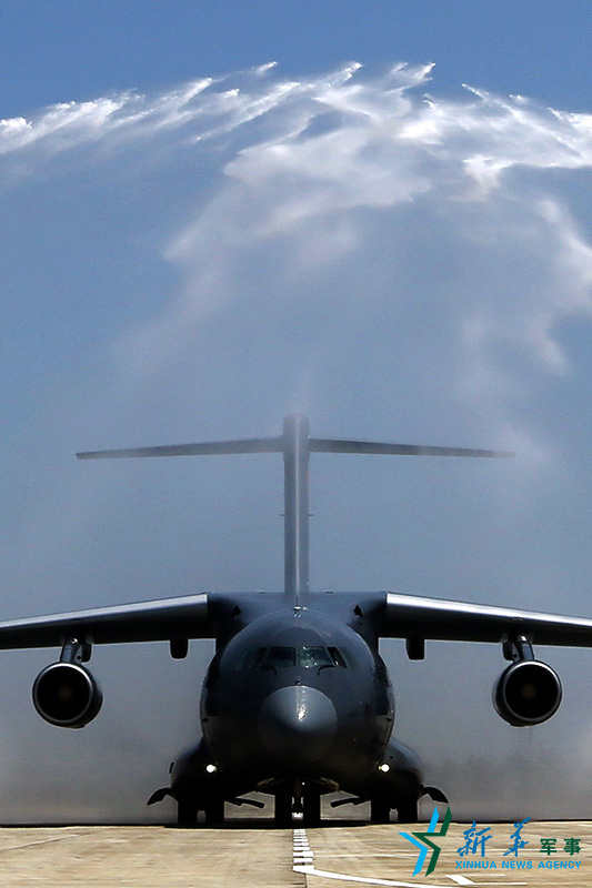 2016年7月6日 中国空军列装运-20飞机提升战略投送能力 运-20飞机滑过水门,接受洗礼。 7月6日,中国空军运-20飞机授装接装仪式在空军航空兵某部举行。 新华社发(刘畅 摄)