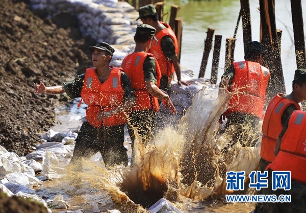 7月8日,武警官兵在江新洲长江堤坝上投放沙包,防止江水对堤坝造成直接冲击。受强降雨影响,江西省九江县江新洲堤坝多处出现渗水、泡泉等险情。武警江西总队一支队和九江支队的近400名官兵临危受命,驰援江新洲,采取打桩、沙包固脚等方法处理险情。新华社记者 周密 摄