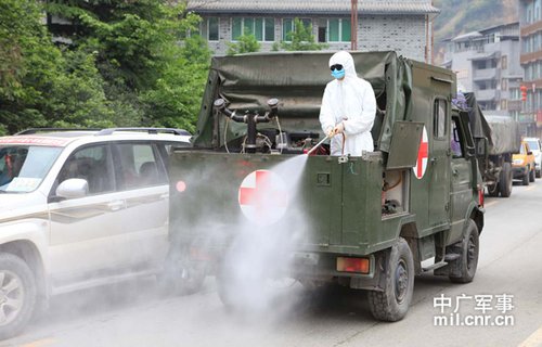 资料图:防疫车在震区进行洗消作业