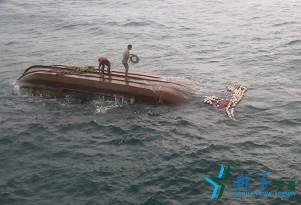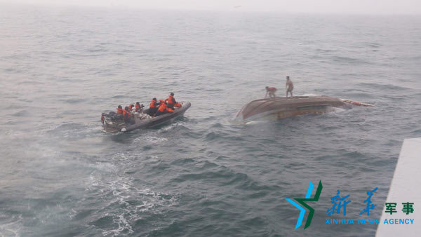 8时左右,泉州舰率先抵达出事地点。官兵们发现遇险船只已倾覆,倒扣在海面,2名渔民站在船底挥手求救。受台风影响,当时海面风力7级,浪高超过2米。渔船随时可能被海浪吞没,情况十分危急。