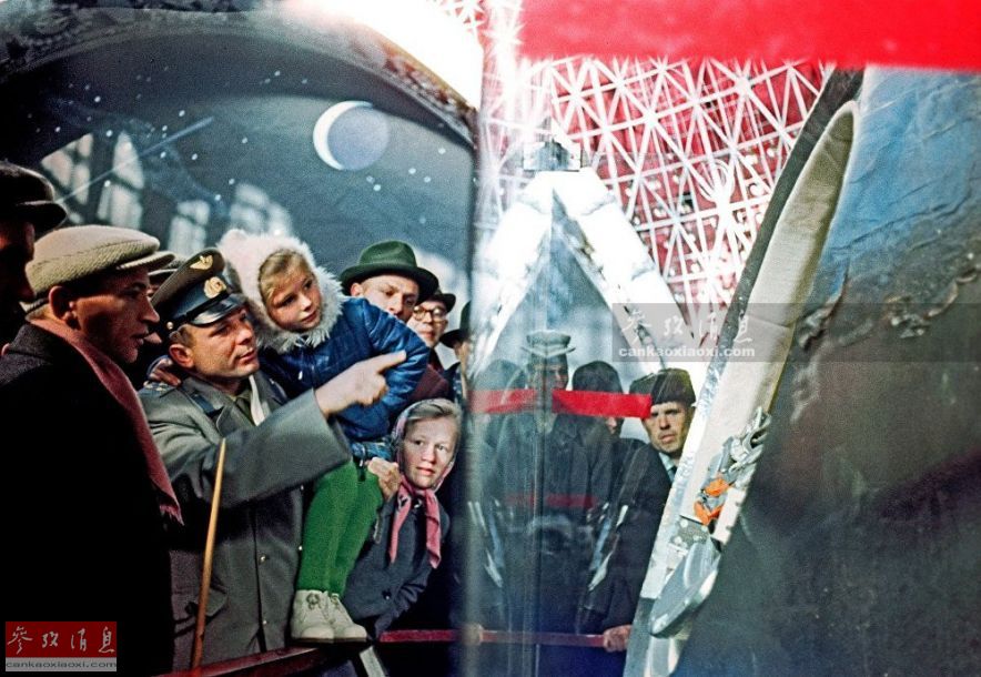苏联宇航员尤里•加加林(左二)向女儿莲诺奇卡(左三)展示他飞往太空的飞船。