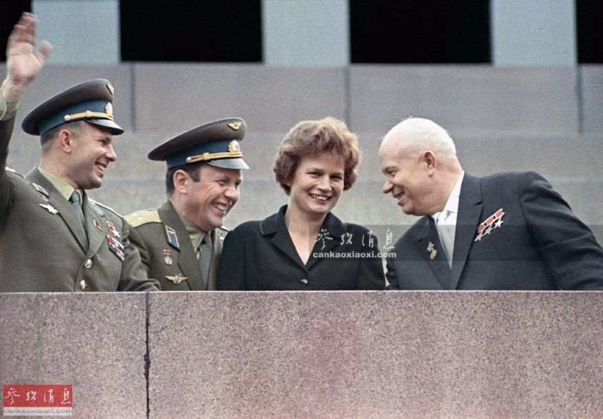 在纪念瓦列里•贝科夫斯基乘“东方5号”宇宙飞船、宇航员瓦莲京娜•捷列什科娃“东方6号”宇宙飞船成功完成太空飞行的群众集会上,苏共中央委员会第一书记、苏联部长会议主席尼基塔•谢尔盖耶维奇•赫鲁晓夫,宇航员瓦莲京娜•捷列什科娃,帕维尔•波波维奇和尤里•加加林(自右至左)在红场列宁墓讲台上。