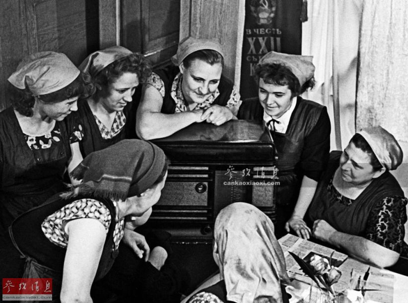 阿拉木图缝纫厂的女工们在通过收音机倾听塔斯社播报苏联宇航员尤里•加加林于1961年4月12日在世界上第一个完成太空飞行的消息。