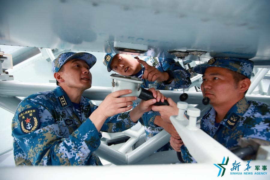 范文武(左一)在宿州舰与专业骨干研究装备性能。(2016年7月1日 )新华社记者查春明摄