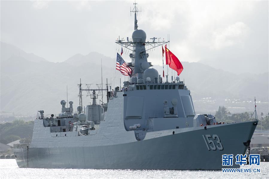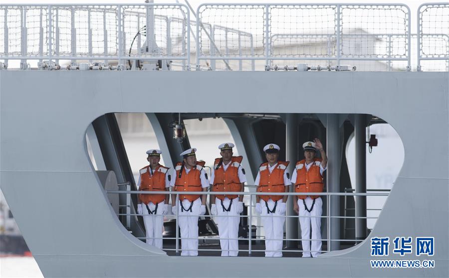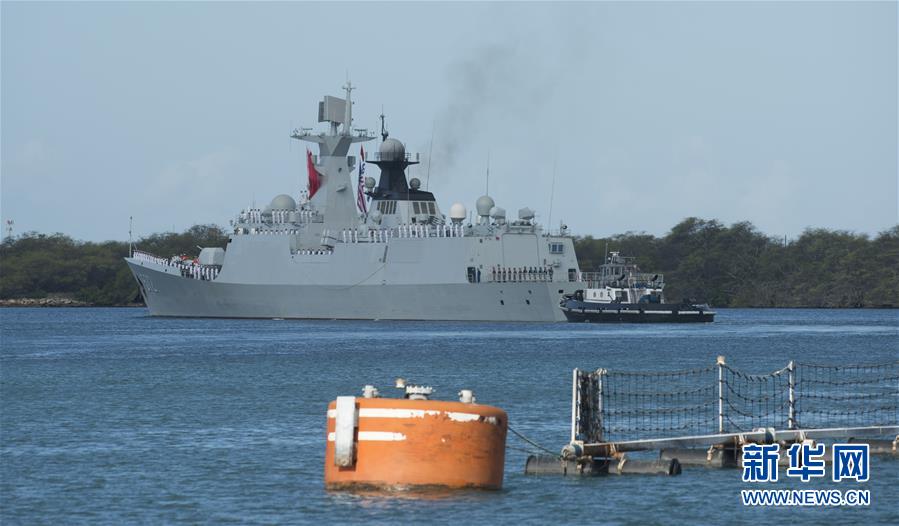 7月12日,在美国夏威夷珍珠港,中国海军综合补给舰高邮湖舰官兵在舰上挥手致意。当日,中国海军导弹驱逐舰西安舰、导弹护卫舰衡水舰、综合补给舰高邮湖舰驶离夏威夷珍珠港。参加“环太平洋-2016”军事演习的中国舰艇编队顺利完成港岸训练,导弹驱逐舰西安舰、导弹护卫舰衡水舰、综合补给舰高邮湖舰于当地时间12日上午陆续出海,到预定海域开始进行海上实施阶段的演习项目。新华社记者杨磊摄