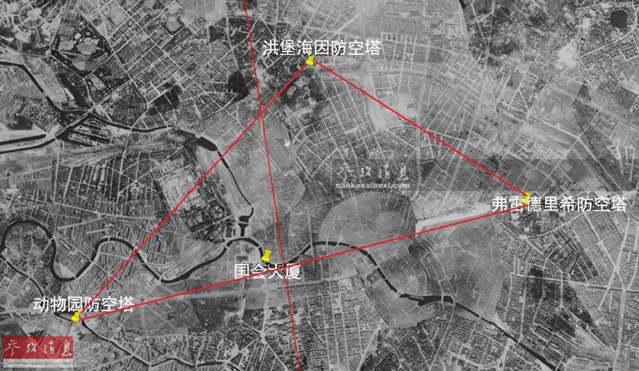 当时这一工程的总负责人由有着“希特勒御用设计师”之称的施佩尔负责。当1941年3月,位于柏林动物园的1号防空塔完工时,其总建造费用达到550万帝国马克,而位于弗里德里希山的高射炮塔2号完工时,其建造费用竟达到了2400万帝国马克之多。上面的位置图可直观看出3处防空塔构成的三角形区域中心即为柏林核心区。