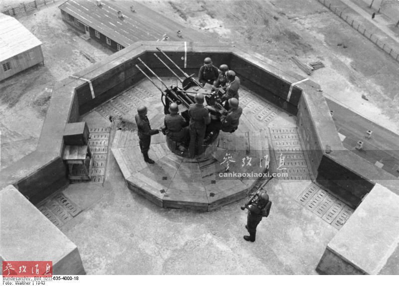 图为1943年拍摄的柏林防空塔上的四联20毫米高射炮演练情况,可见防空塔厚实的外壁。