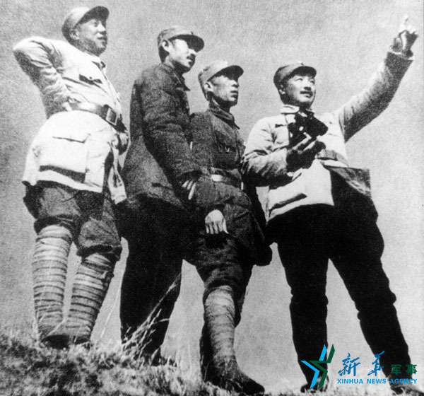 1937年10月18日,358旅716团在山西雁门关以南,伏击日寇300余辆汽车的运输队,击毁敌汽车数十辆,歼敌500余人。图为120师领导在战前观察地形。右起:贺龙、周士第、关向应、甘泗淇。