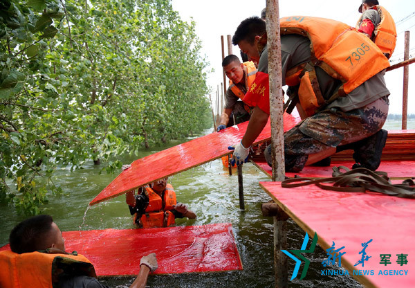 7月14日,陆军第1集团军某旅官兵在九江市湖口县舜德乡大桥坝展开搭架铺路作业。赵恒摄